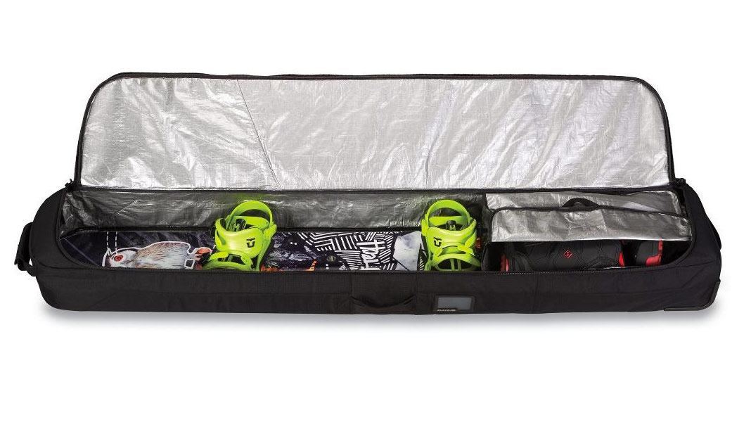 The Dakine Low Roller black Snowboard Luggage Bag is one of our favourite board bags for travel. It's super tough with extra buffers on the corners and has more than enough space for board, bindings and boots plus extra clothes and equipment for your trip. With a good solid wheels and handles it makes it easy to drag the board kit around the airport or train station etc.