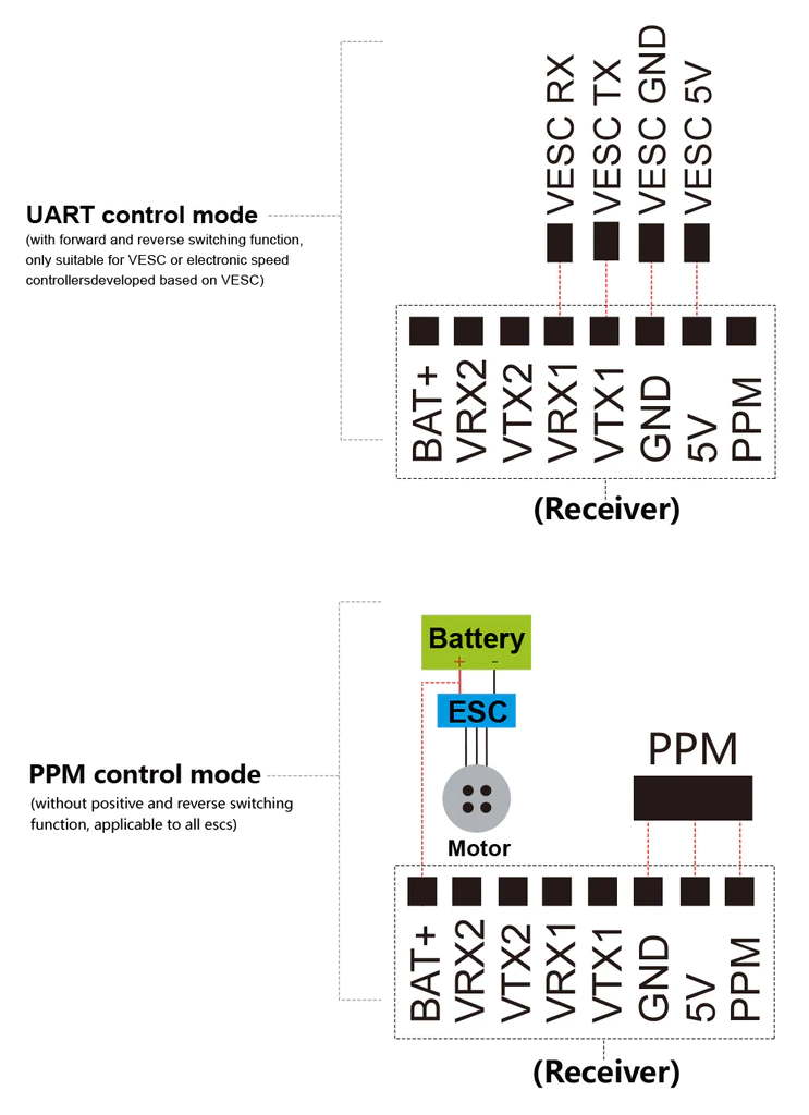 - VX4 remote comes with receiver and cables for VESC4, VESC6 and PPM