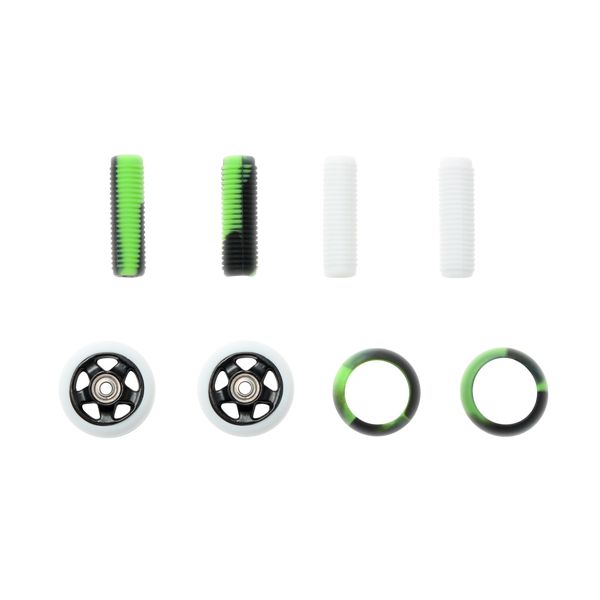 Blunt Envy Finger scooter parts, coming with a pair black cores and white PU around the wheel. Coming with a spare set of PU rubber for wheel which are in Green and Black. With two different sets of handlebar grips which are in white and an other set in green and black.