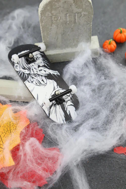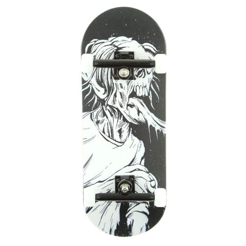 Unleash your inner darkness with the Skull Fingerboards Reaper graphic deck. A black and white deck, colour matched with the trucks and wheels to give a dark feel. The skeleton-style zombie figure is sure to provide you with the chills. Skull have upgraded the graphic, which is now UV printed, this provides a higher quality, more durable print.