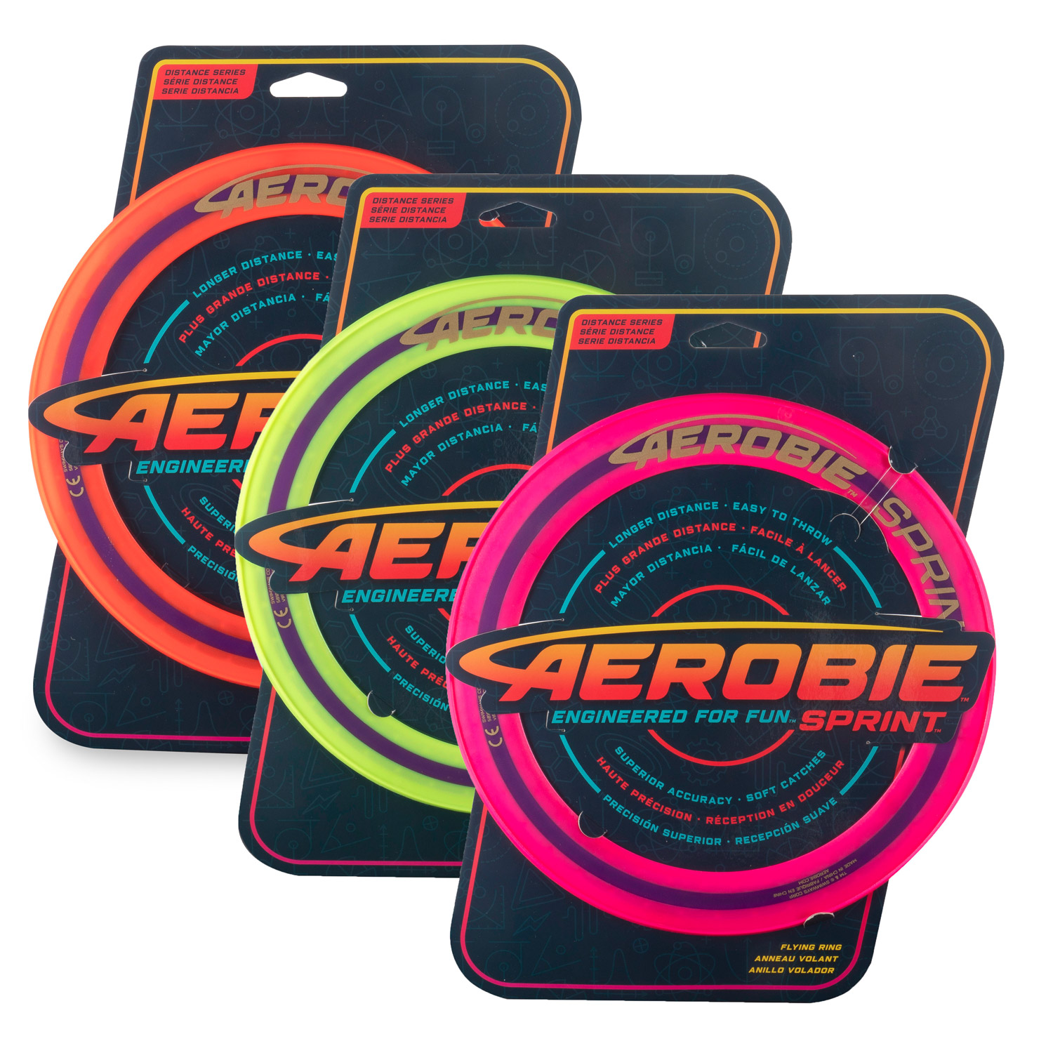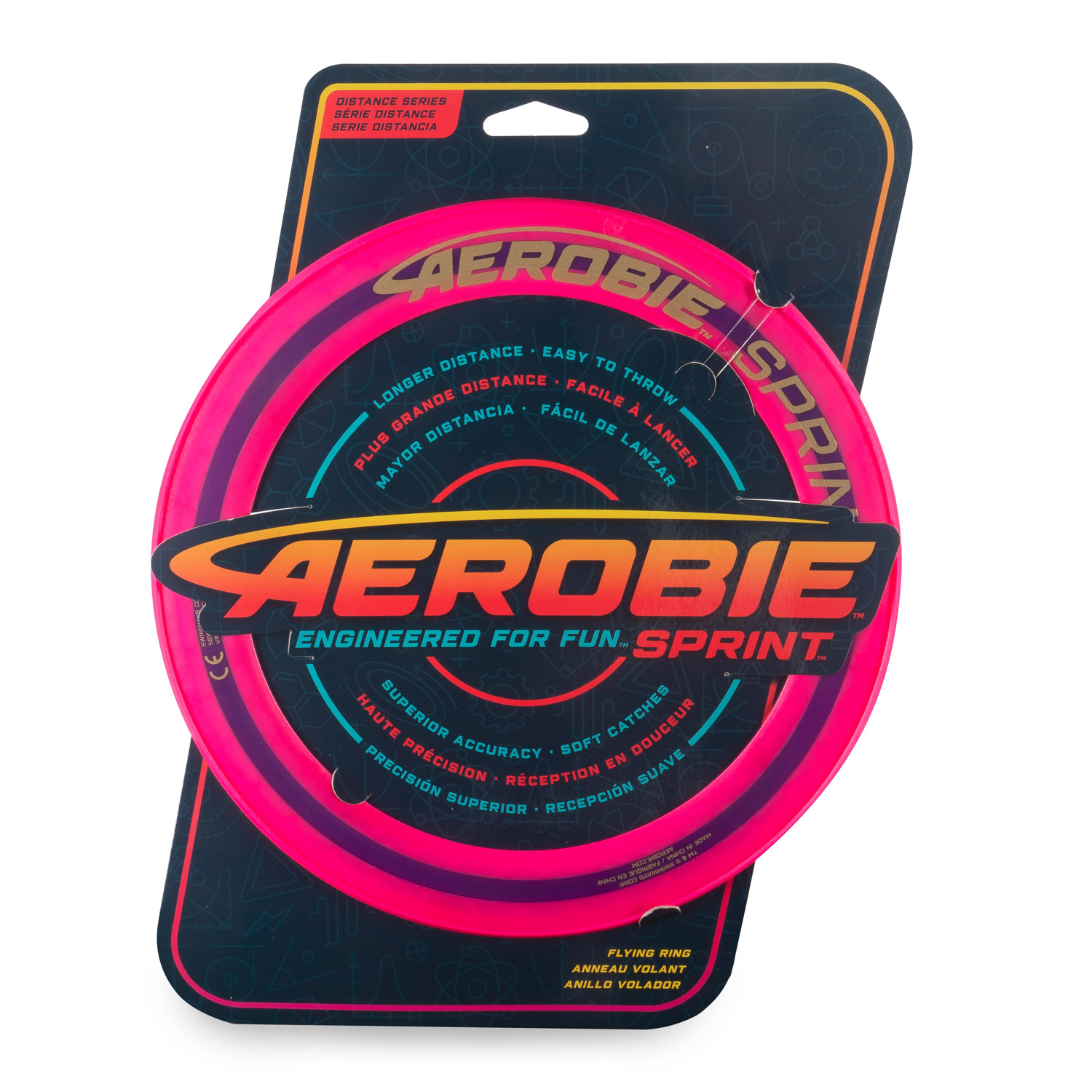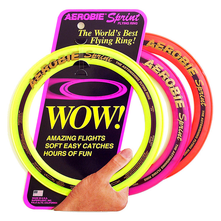 The Aerobie Sprint Ring is the smaller version of the Pro Ring but that does not mean it is any less. It does not fly quite as far but that means you don't need to walk as far to get it! It is a great fun toy to play with easy to throw and catch. Fun for everyone!