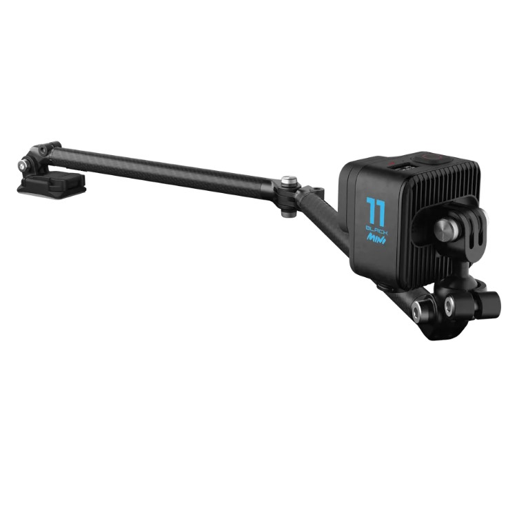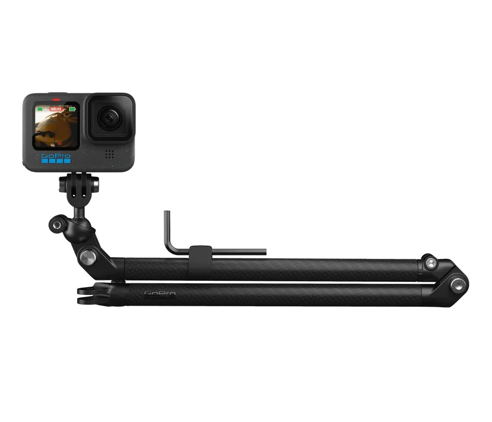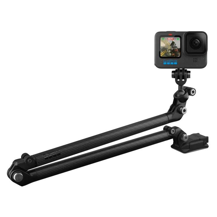 There are many times over the years we wanted the camera just back a bit more... well that is exactly what the boom is for. Just as the name suggests this is a long carbon fibre extension in two pieces that allows you to put the GoPro out on a boom for more of a third person shot. It has an integrated ball joint and swivel points. This version comes with the adhesive mounts for simplicity but you can connect it onto other attachments instead such as a suction cup, roll bar mount, handlebar mount or even a surf mount more a bigger sticky mount option. We have even seen people use two boom kits to create a stable triangle structure. The only limit is your imagination and collection of mounts!