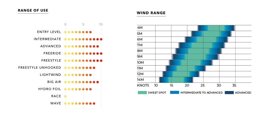 Featuring an open-c shape, semi swept leading edge and square wing tip design providing a large depower range, progressive handling, boost for jumping and drift in the waves! and adjustable 3 stage variable bridling.