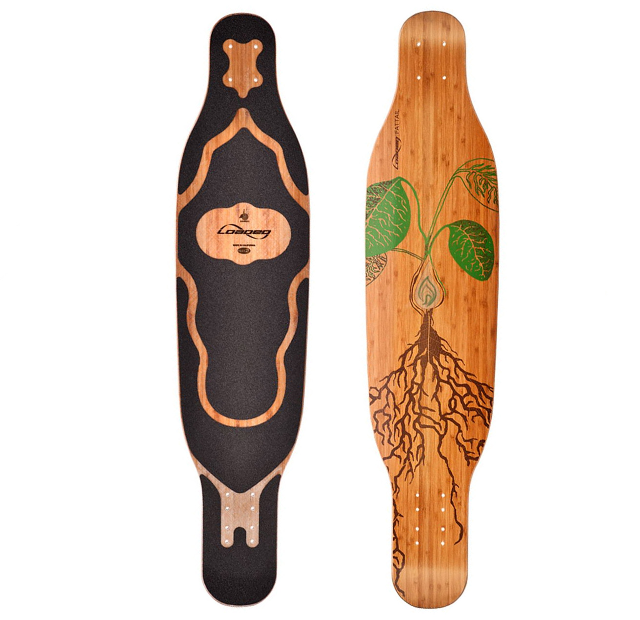 Increased concave locks your feet in, while the top mounted and cambered platform provides energetic performance in and out of each carve. The width of the deck has been redistributed while maintaining subtle tapering near the trucks to provide both ample leverage and awareness of foot position while powering through turns. The formerly vestigial tail has received the silicone treatment for improved functionality in both freestyle tricks and surf-style shredding. The FatTail’s shape and contours has been redesigned to ensure more consistent flex characteristics throughout the entire length of the standing platform when using either wheelbase. The camber of the original Pintail has been kept, the concave has been increased and a full (if chunky) kick tail ahs been added. A vertically laminated bamboo core is sandwiched between fibreglass skins. The tail is reinforced with an additional layer of fibreglass (top) and carbon fibre (bottom) for added stiffness and abrasion resistance. The bottom is finished with a bamboo veneer with a die cut water droplet pattern, which is filled with transparent urethane and a “floating” graphic to give a sense of dimensionality.
