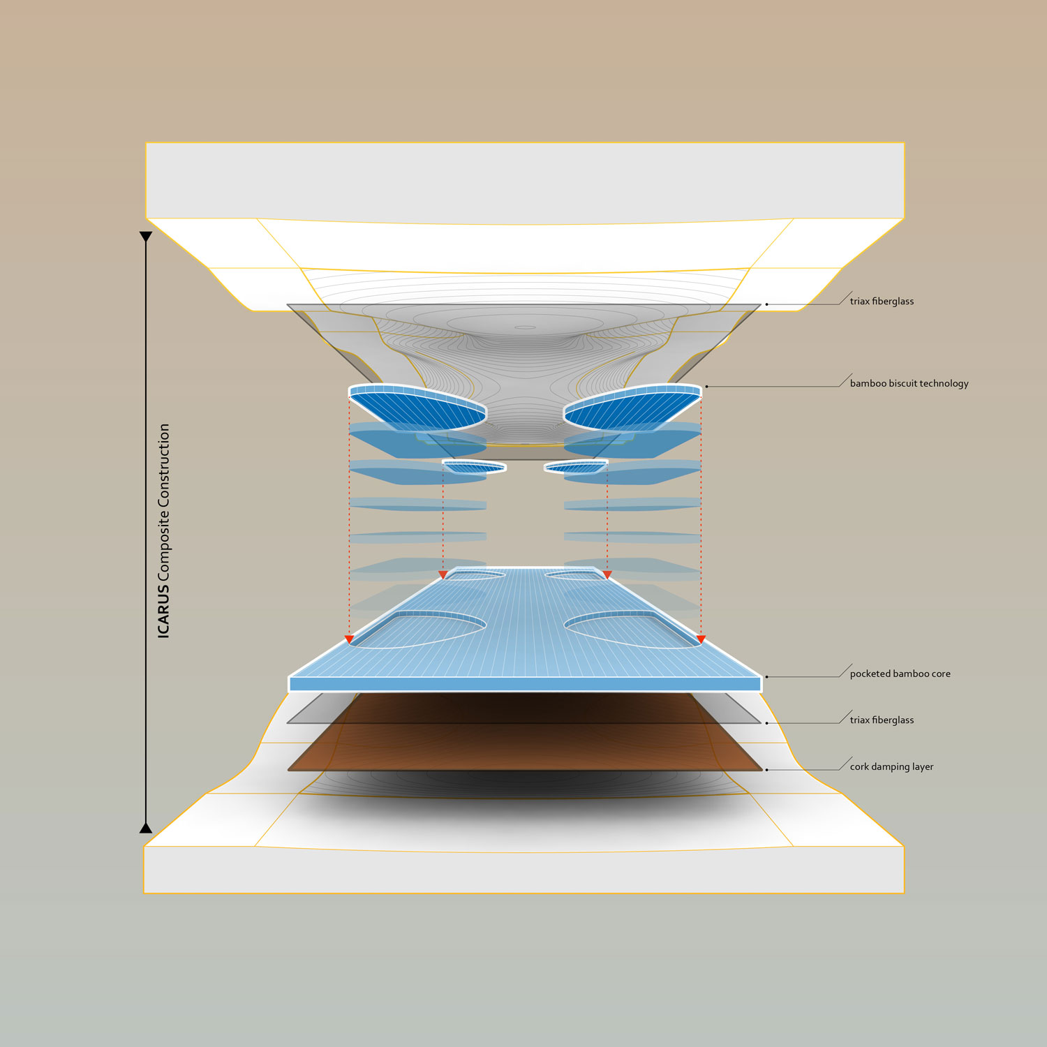 Powerful Flex - Laminated Bamboo and fiberglass construction with a cambered profile and variable concave produce a lively ride. The cork on the underside helps to dampen the board and reduce vibration without compromising board feel.