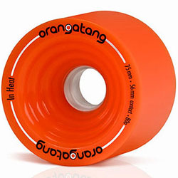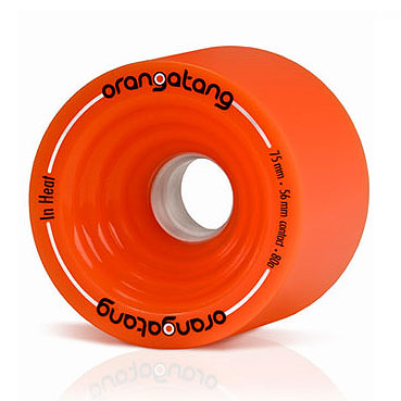 Orangatang In Heat 75mm Longboard Wheels from Loaded Longboards - Orangatang In Heat Orange Wheels are 75mm tall with a contact patch (width of wheel in contact with ground) of 56mm. These wheels are intended for grippy, hard carving, pumping and speed. They will slide when broken in. The In Heat features a slalom influenced offset design, with hard sharp edges for grip, thick lips for maintaining speed, and rippled inner walls for progressive energy return.