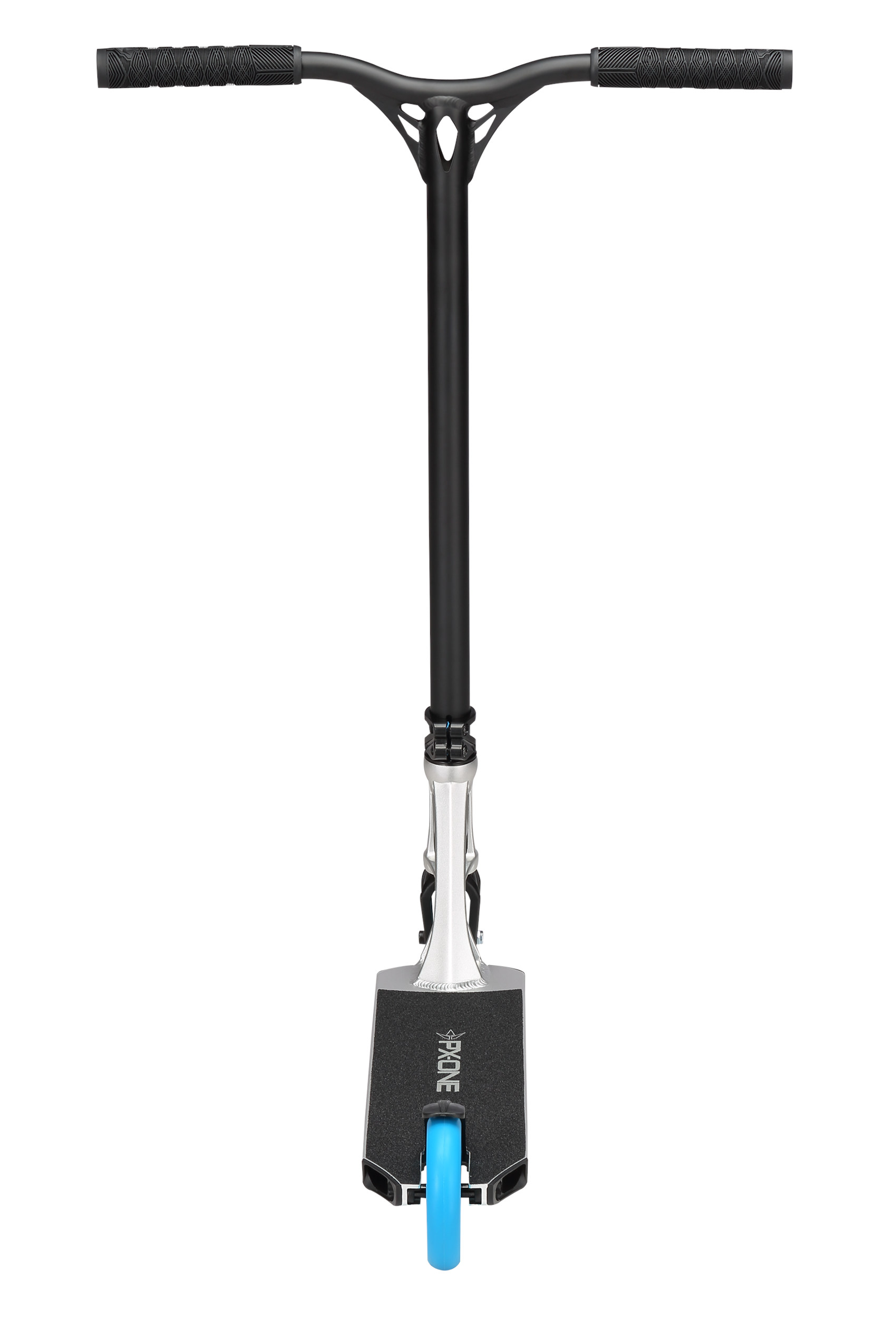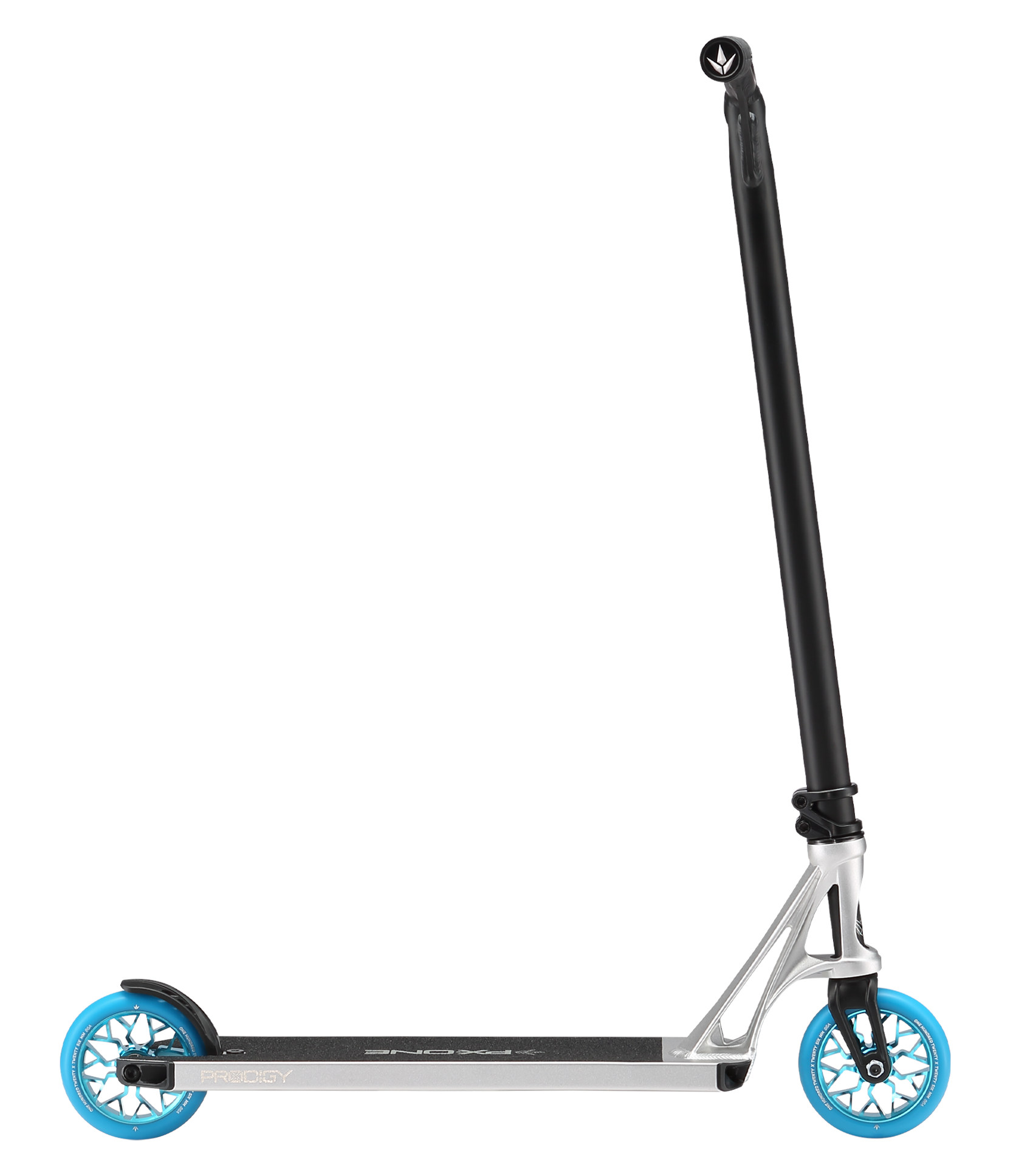 The Blunt Prodigy X One Silver Stunt Scooter is the eleventh version of the prodigy line which has been developed over 12 years of production. The Silver is a striking new colour with annodised silver deck and blue wheels with black bars, fork, clamp and wheels finish the smart look. The X One edition of the Prodigy scooter is a tweak from the Prodigy X with some strength modifications to the deck extrusion with thicker wall thicknesses. The headtube has been modified to give more strength and contact to the deck with new anchor weld underneath so it can take anything thrown at it!