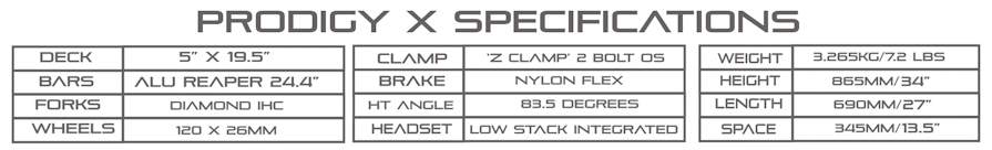 The classic setup that has made the prodigy the park scooter of choice is still there; the lightweight aluminium Reaper V2 bars, the Aluminium IHC Diamond forks, the durable TPR Handgrips and Nylon Flex Brake but the rest of the scooter has all new parts! The biggest change in the scooter is the new X Series Park deck, which has a new footplate that is wider, thinner and stronger with a more responsive concave. The headtube section has also seen some upgrades with a new diamond cut out and profile to be stronger connection with the deck and reduce weight. The deck is now 5in wide x 19.5in long for the Prodigy X Park.