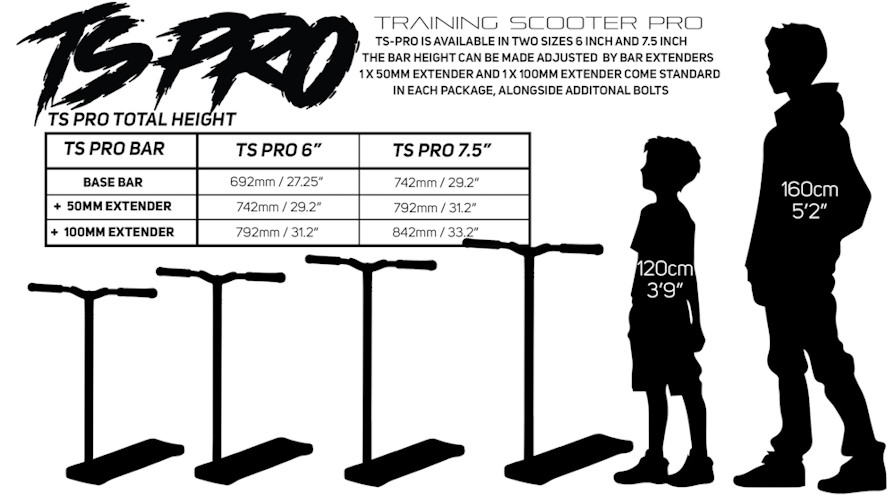 Its not just one size fits all with the TS Pro, especially when your learning, the right height can have a huge impact on how fast you learn. Each training scooter comes with 2 additional pieces to offer more height onto the handle bars .This allows each rider to suit the scooter to them based on the height. skill level and preference from other complete scooters. The thing that makes this scooter unique and a better option than others on the market is that it can support your standard bars and clamps, which gives those more experienced riders that freedom and creativity when it comes to customising there training scooter. It is the perfect training scooter for all abilities and ages when learning or improving.