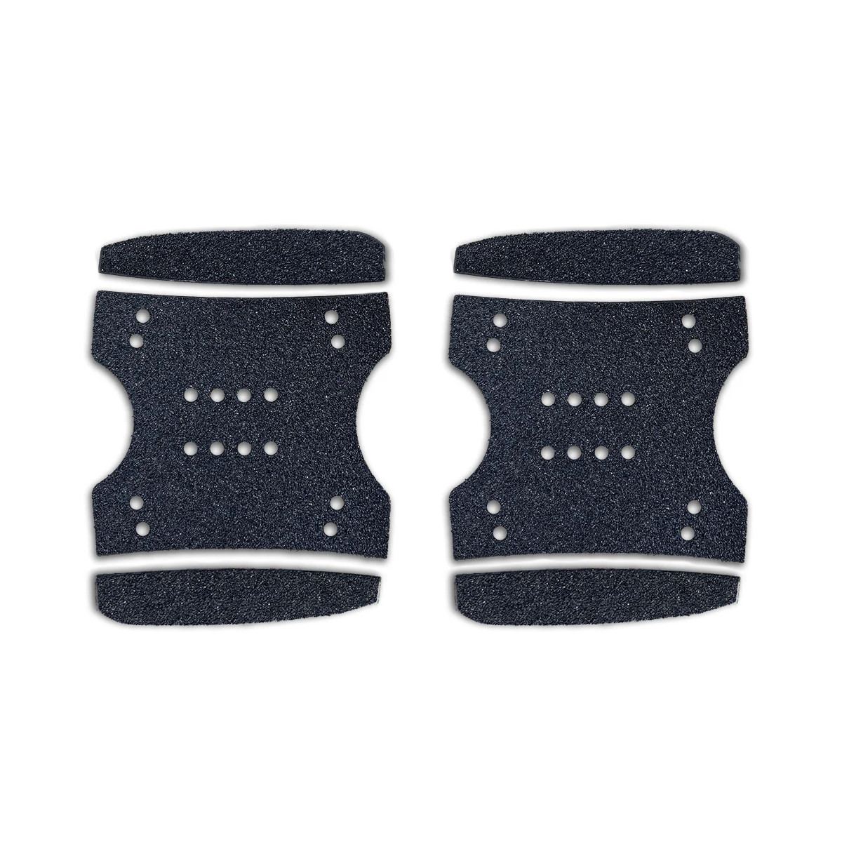 Built for the superwide MBS Agent deck these grip pads have a concave grip and are split into the middle and two outers per foot. There are the holes there for traditional F5 Bindings and the snowboard pattern for the new F5X bindings and others. Self adhesive grip pads with the grip tape already applied.