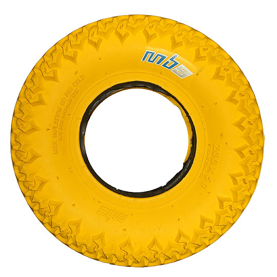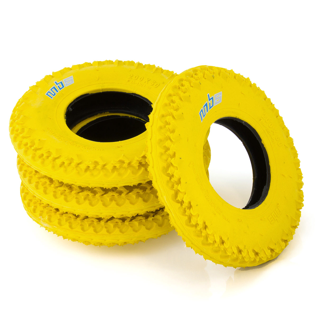The MBS Yellow T3 Tyres is the third tyre from MBS's factory. This is aimed at providing more lateral side grip than the T1 Tyre. It is still a light 2 ply tyre but it is a flatter profile with a double centre ridge and higher knobbles at the edges. This makes more rubber in contact with the ground and provides more side grip. This is ideal if you find you need more grip than the T1 tyres.... for example it will allow more power to be held with a kite and better upwind performance. Or will hold a tighter line in a corner on a race track. Because there is more rubber in contact there will probably be a slight slow in acceleration as there is more drag than the T1 but it will be a trade off to less slide in the corners! We will have to see how the tyres perform in the races this year!