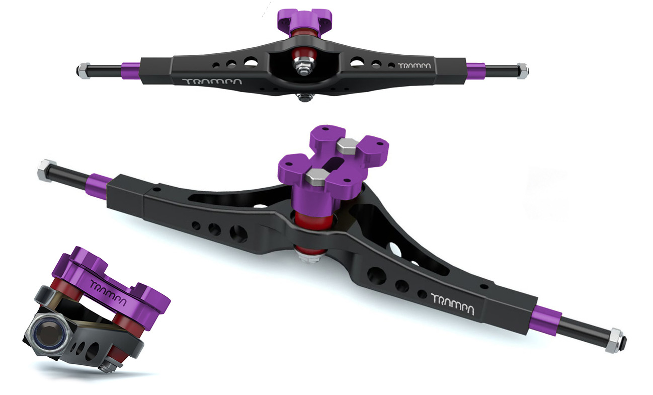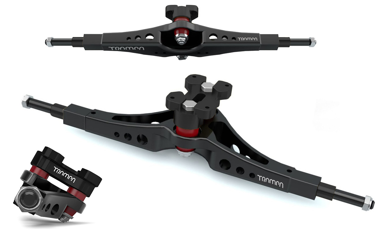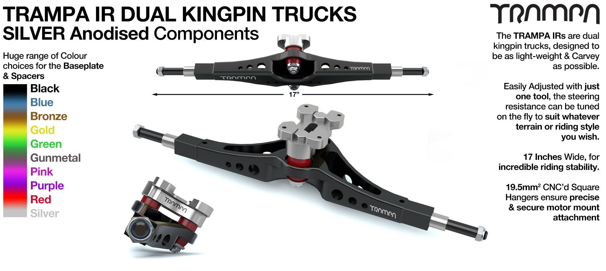 The Trampa IR truck offers a different feel and ride to normal channel trucks and skate trucks. With two parallel kingpins and the axle slightly offset then it offers a smooth turning truck that absorbs rough terrain. Coming in a inch wider than most channel trucks and with the 19.5mm cnc axles to allow more clearance for electric drive units. Choice of several different colours in the baseplate and axle spacers as you would expect with Trampa!