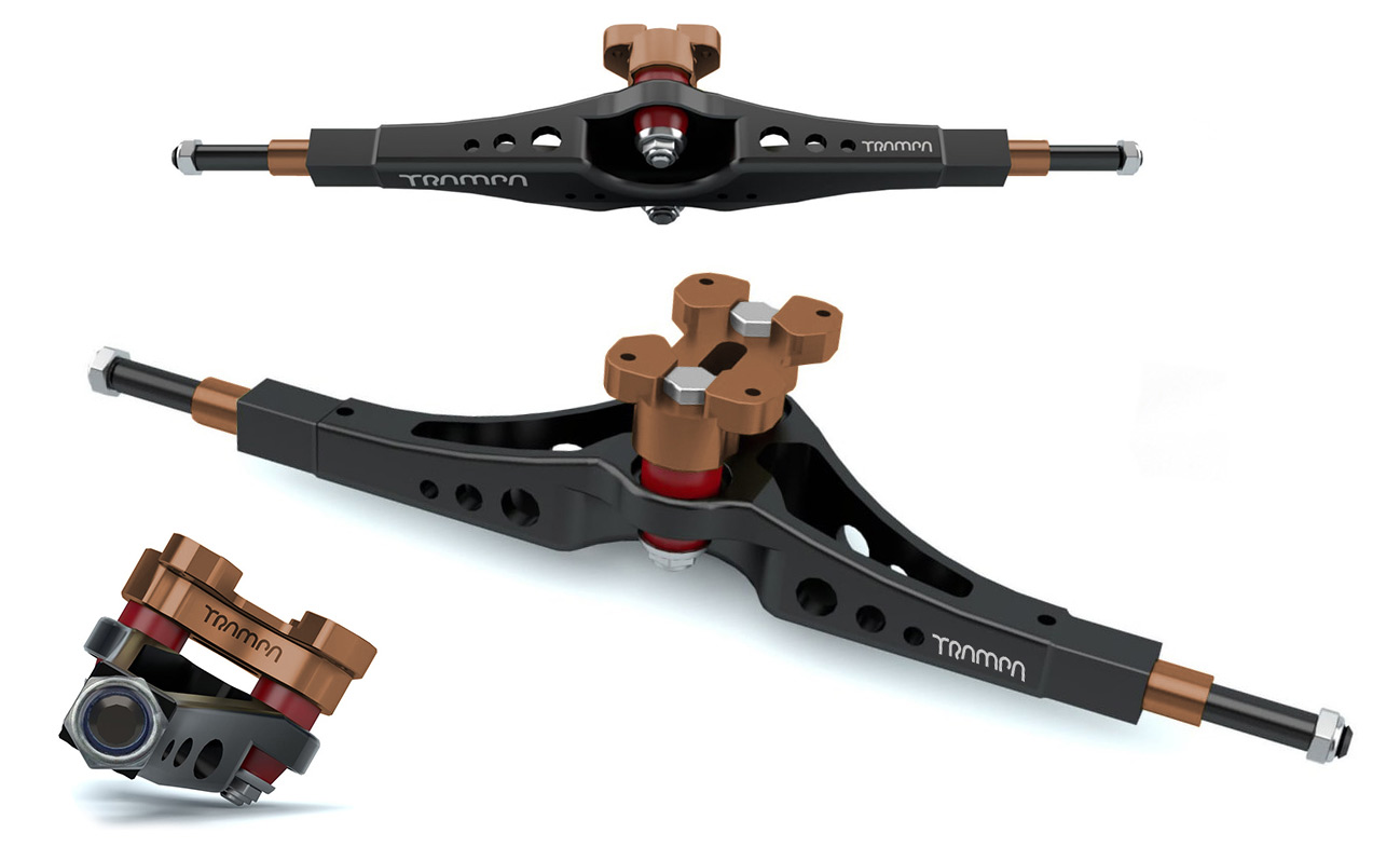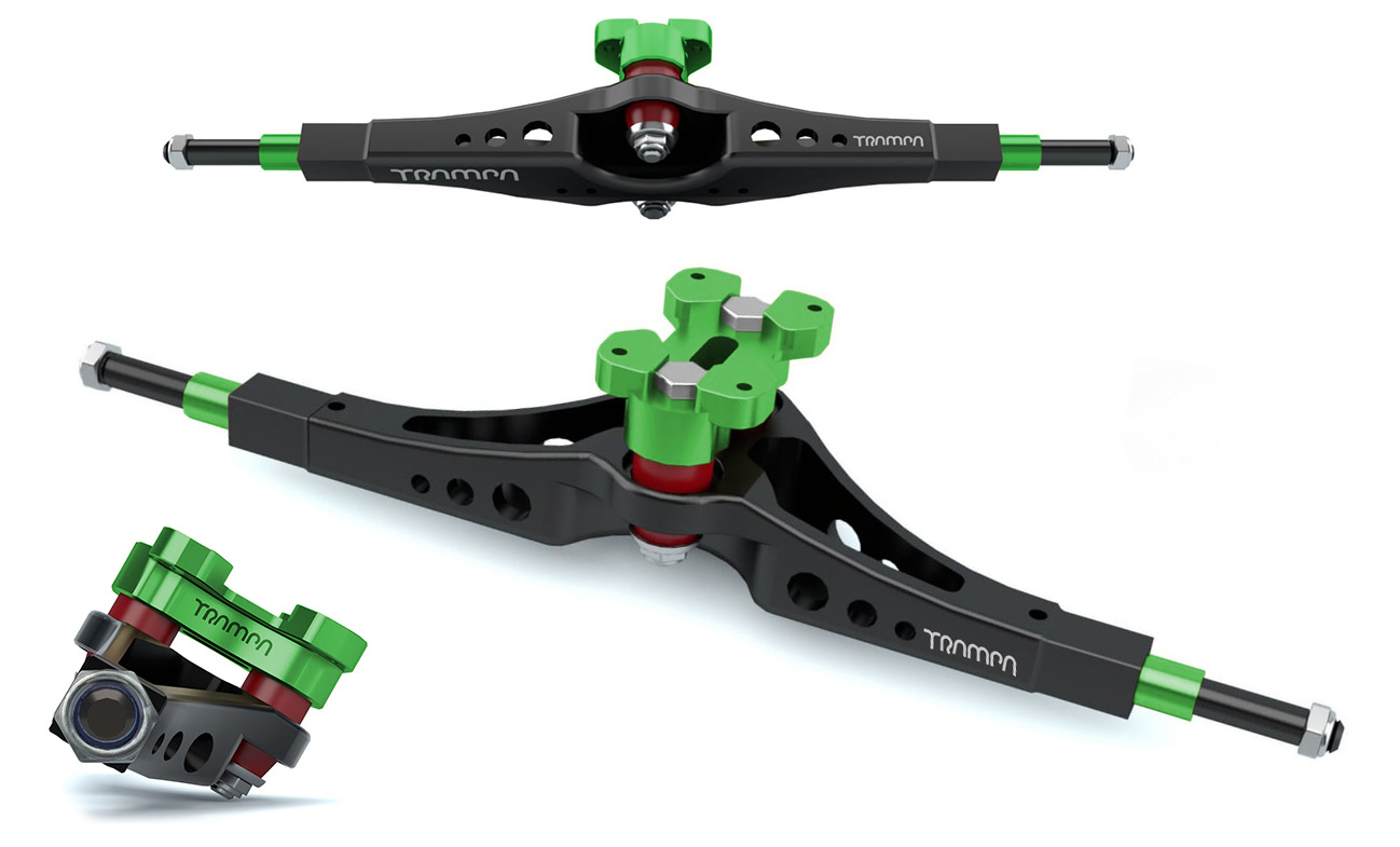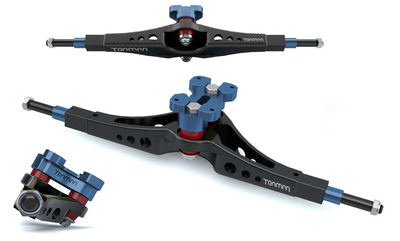 The Trampa IR truck offers a different feel and ride to normal channel trucks and skate trucks. With two parallel kingpins and the axle slightly offset then it offers a smooth turning truck that absorbs rough terrain. Coming in a inch wider than most channel trucks and with the 19.5mm cnc axles to allow more clearance for electric drive units. Choice of several different colours in the baseplate and axle spacers as you would expect with Trampa!
