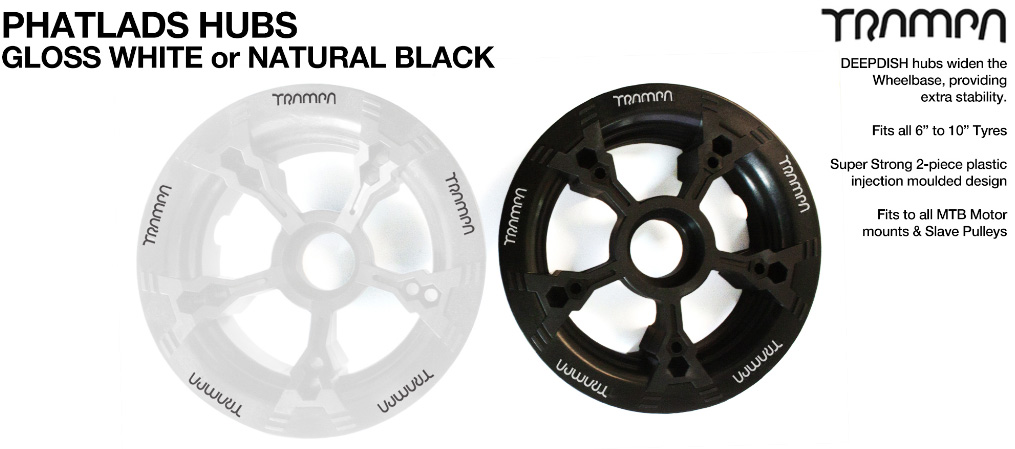 The Trampa Phatlads Gloss White is the pimp version of the Phatlad hub we have been asking for a while a versatile hub that works with almost all tyre sizes and really great on larger than average tyres i.e. 9in and 10in tyres. The larger tyres don't fit the hubs optimised for 8in tyres as they need a larger rim and also need to be a bit wider for the tyre to sit nice. The phatlads also add an extra benefit of being a deep dish offset hub so pushes the tyre out further again great on a bigger tyre. The Trampa Phatlads are available in a natural black and a pimp white colour.