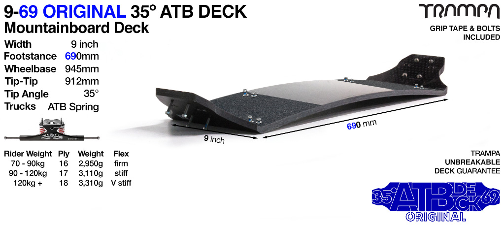- Deck: 35° Long Mountainboard Drilled, edged and fitted with Grip tape