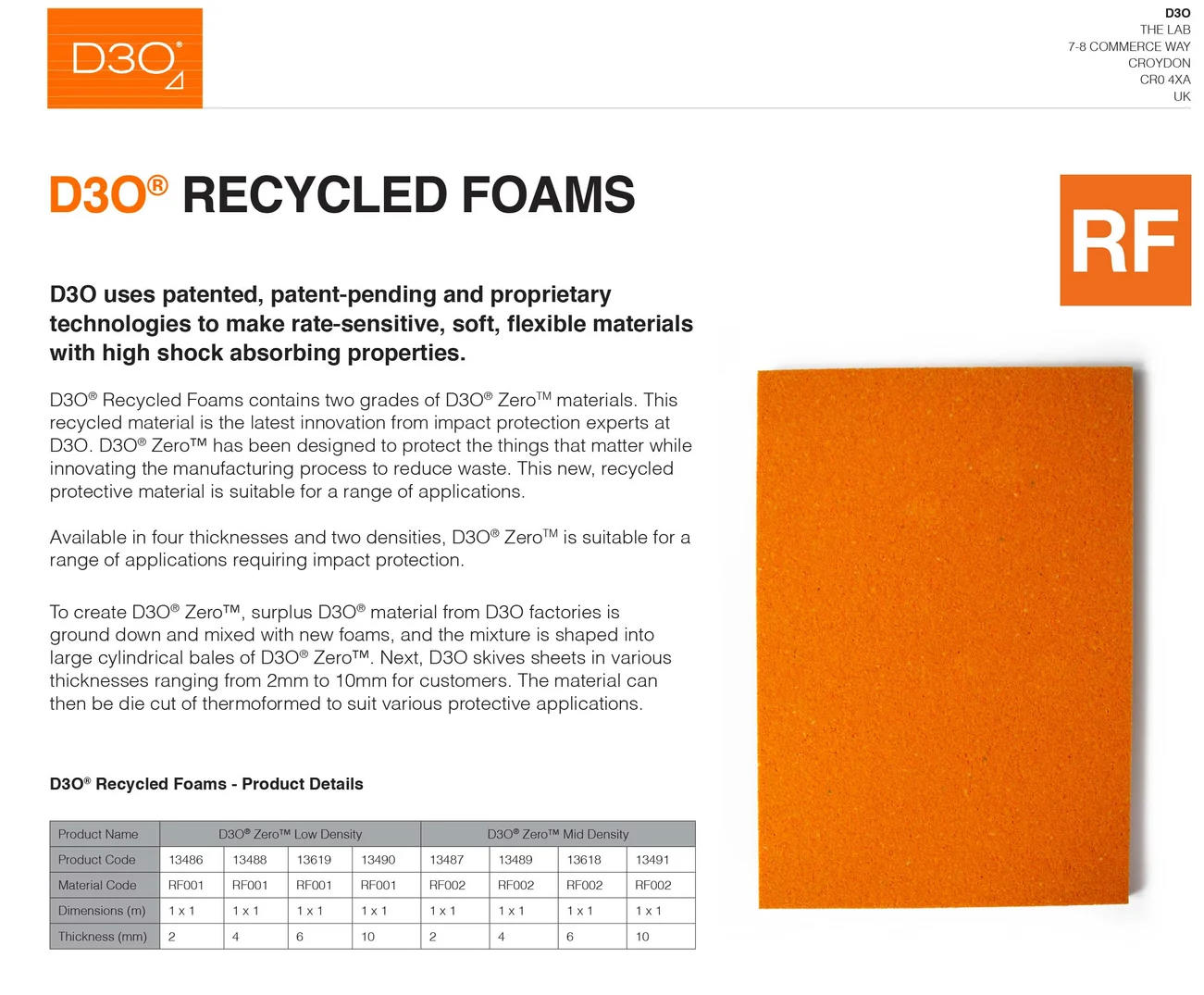 - D3O® ZeroTM has been designed to protect the things that matter while innovating the manufacturing process to reduce waste. This new, recycled protective material is suitable for a range of applications.