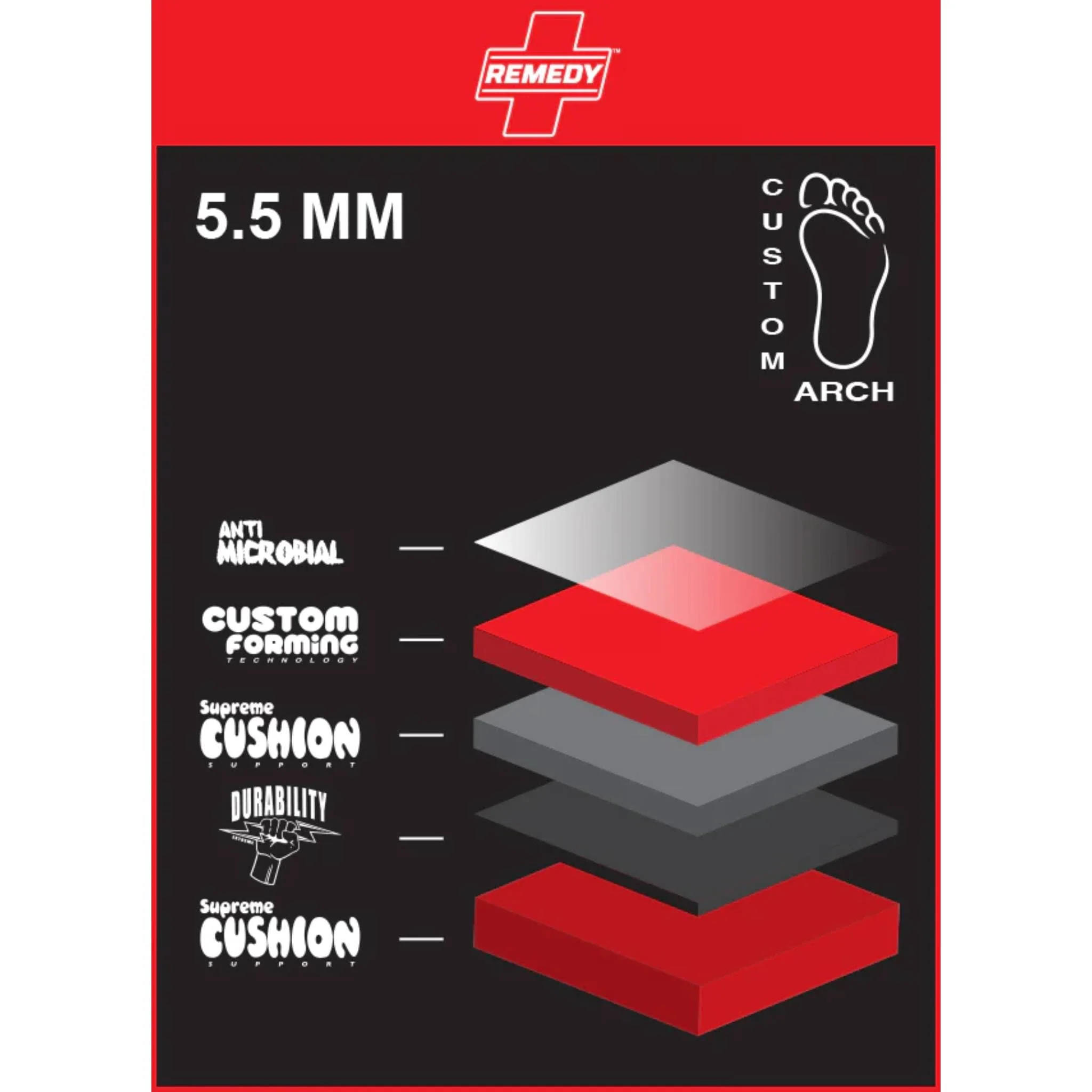 Remind The Remedy heat mouldable insoles have a four-layer foam impact rebound system made up of the highest quality materials built to withstand every type of footwear abuse. Its anti-microbial and anti-friction fabric systems reduce hot spots and blisters, keeps the feet cool, dry, odourless and gives you excellent foot grip for enhanced control and stability.