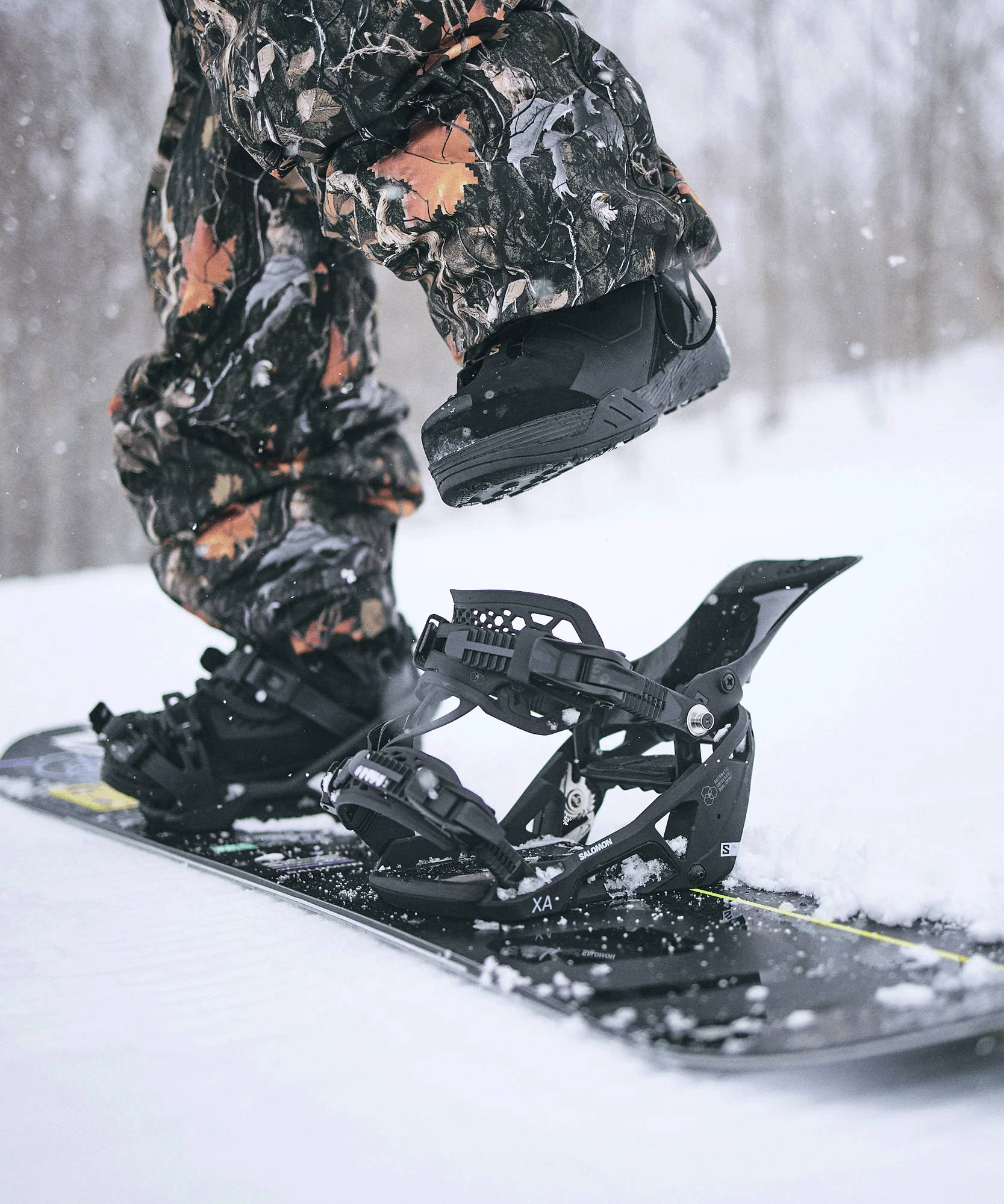 The XA Supermatic bindings from Salomon are a collaboration between two giants in Snowboarding. Using the Nidecker fast entry system partnered with Salomon's medium to stiff asymmetrical highback offers a great binding for someone who is need of a binding they're able to push to their limit and get the feedback and the riding they desire, whilst also offering the fast entry/exit system to keep up with the Skiers off of the lift.