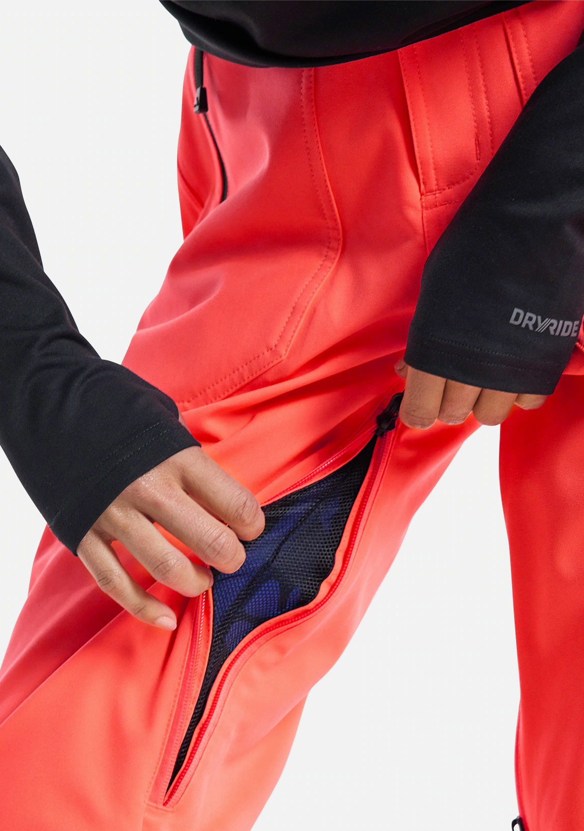 - DRYRIDE two-layer recycled polyester stretch fabric [10,000mm/5,000g] is highly breathable, waterproof, and quick drying