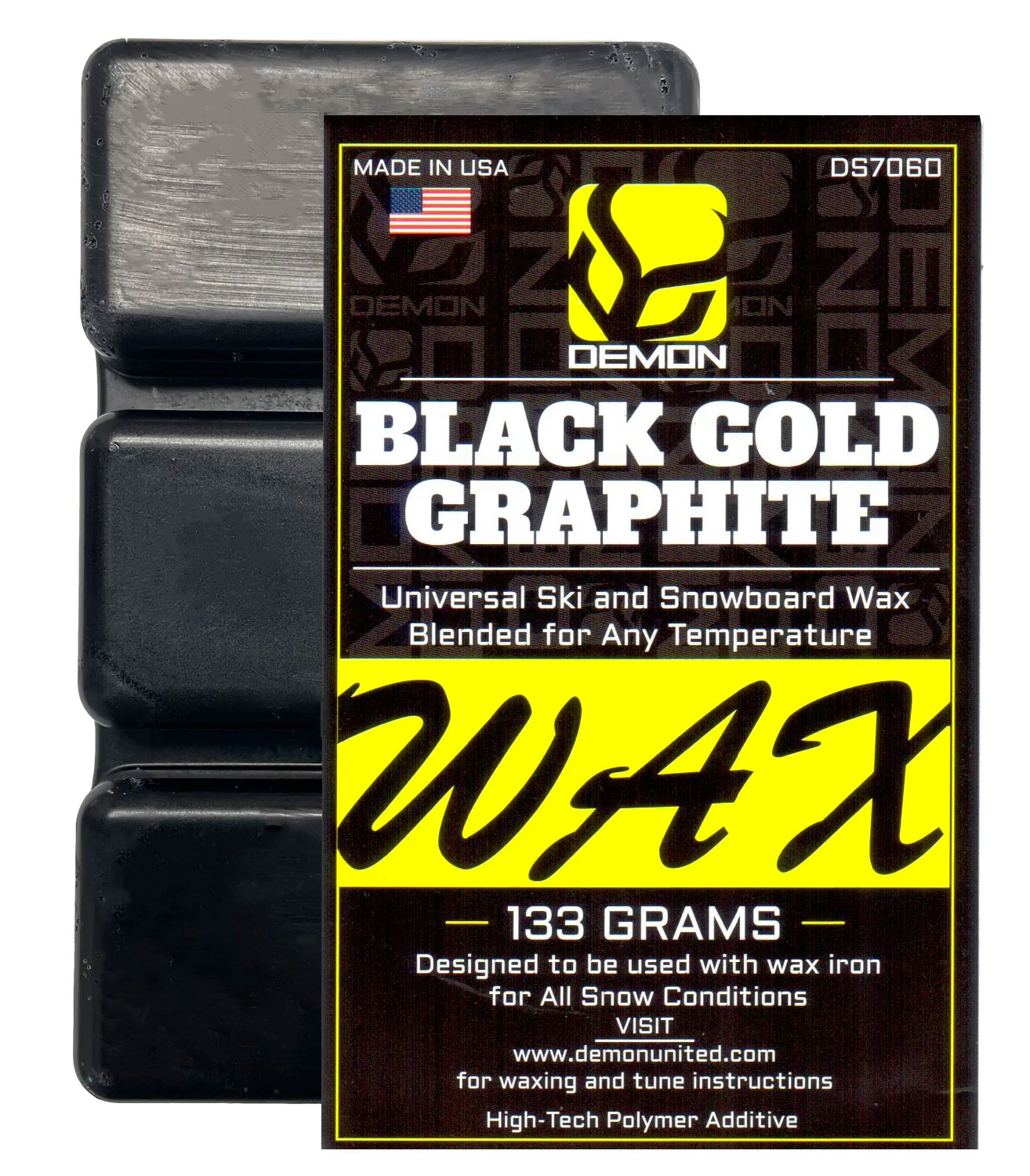 Demon black gold speed wax, Perfect for any rider wanting to get down the slope first which is a high-performance blend of graphite and special additives to ensure the best wax for your ride down the slopes. Grab the Demon iron, scrapper, and buff pad and give your ride the ultimate speed wax.