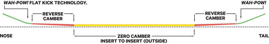 Camber- PARK V2 These versatile boards feature a freestyle Flat Kick shape with double inverted camber. A zero-camber section throughout the insert offers a stable skate-style feel, while the raised contact points turn on a dime and float effortlessly through the powder.