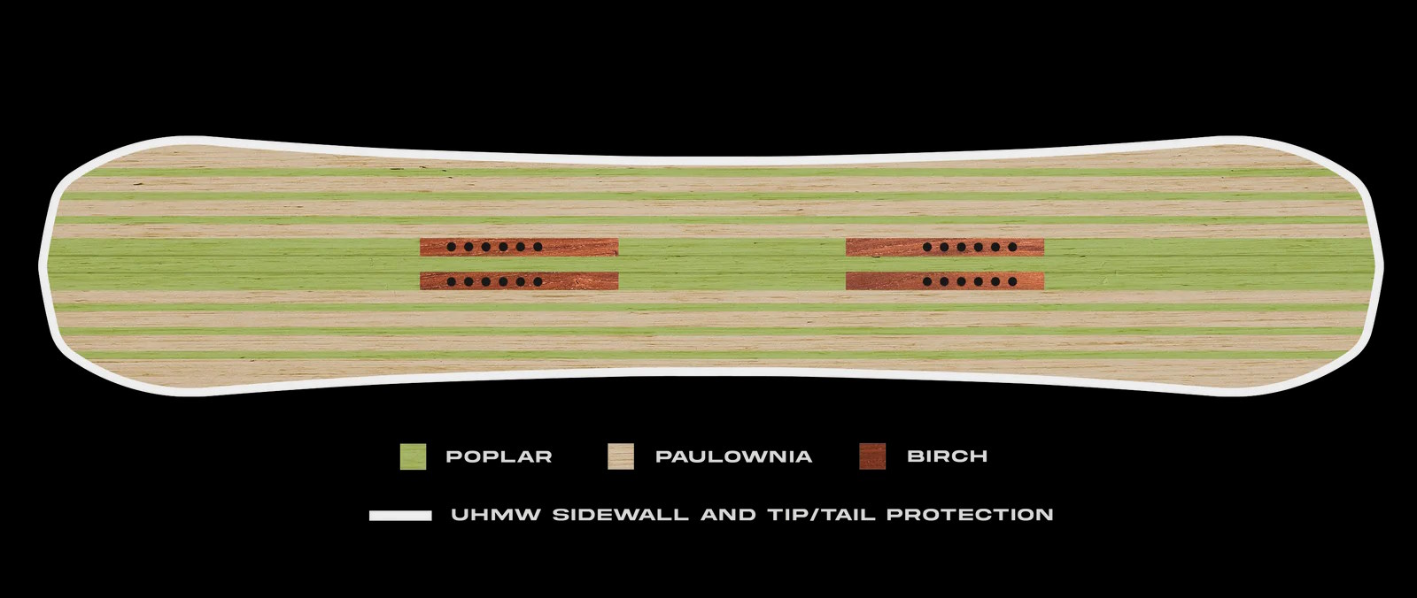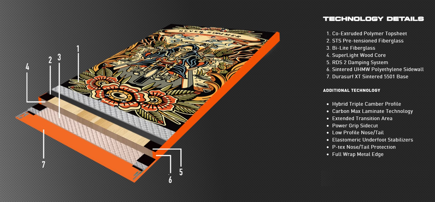 The Never Summer Easy Rider was originally named on the graphic but the board suits the name! This is a true twin mid flexing all mountain freestyle board with the Triple Camber profile. The Triple Camber was getting great reviews but was mostly in the stiffer freeride boards and people asked for a softer board more like the Proto. So with the Easy Rider Never Summer have brought that back to a classic mid flex twin board that has been pressed in the Proto Type Two shape. This is a board that appeals to everyone as a daily driver board for everything you can throw it at!