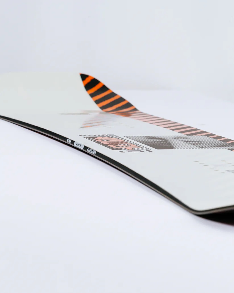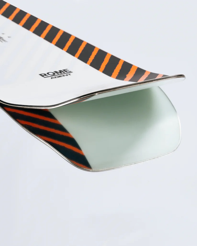 Featuring the upgraded Double kick in the nose and tail increasing the overall stability of the snowboard allowing you to ride to sketchy landings with ease and style. The upgraded nose and tail also allows easier lock in for butters and presses also making it a lot harder to catch with the double kicks . The Rome Agent is built around the idea of that a responsive snowboard makes riding the mountain more fun.
