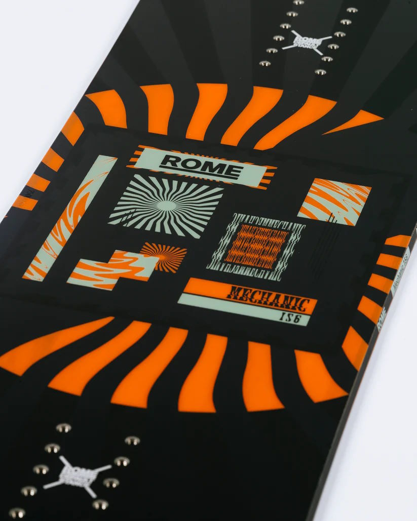 The Rome Mechanic is a true twin tip flat rocker board with mid to soft flex that makes the whole mountain a jib park! Super easy to ride that puts a smile on your face. This is a traditional freestyle twintip board with flat base between the bindings and early rise rocker in the nose and tail which makes it very forgiving and mid soft flexing makes it playful. Normally these kind of rocker boards are a bit soggy when it comes to pop and jumps with the the stomp core layup biax glass and the bamboo hotrods in the tip and tail this is still super fun and poppy. This makes it an ideal board for aspiring beginners to use everywhere, it even surfs nice in a bit of pow! Also those looking for a playful jib board for the park and to rip up the side hits then this ticks those boxes too!