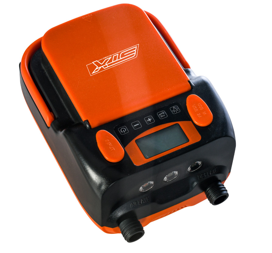For extra fast hands-free pumping anywhere you want! This pump will allow you to reach higher pressures, such as: 20PSI. Includes a automatic stop when selected pressure is reached. There is a battery inside that can be charged from !2V and 240v (EU Plug) and then you can pump up a couple of boards and still have some power to deflate or use the built in torch to pack up in the dark. Perfect for camping adventures as it also has USB outputs to charge phones and other devices. All stored in a convenient carry bag and only weighing a few kg's! If the battery is low then you can power input 12V and directly pump from the cigarette plug of your car, for easy and convenient pumping when you forgot to charge in advance.